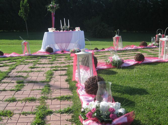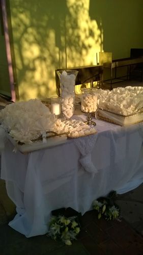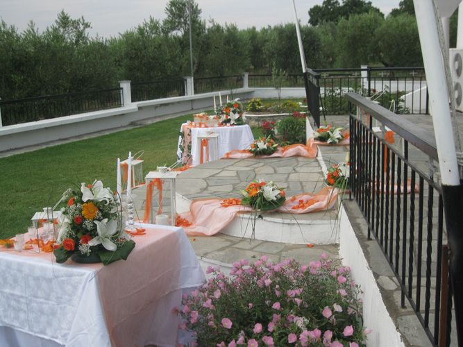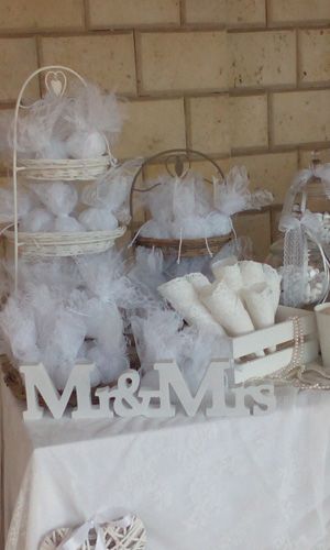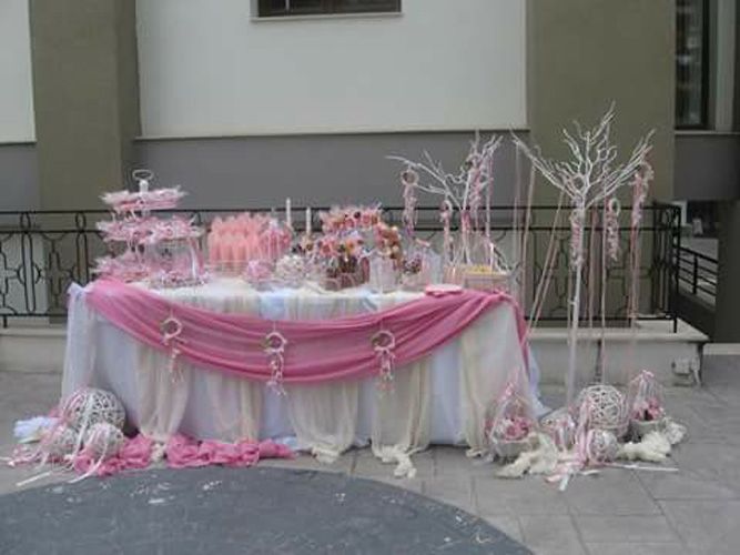 - Στολισμό τραπεζιού με τις μπομπονιέρες (γυάλα με μπεζέδες, σύνθεση με λουλούδια, γυάλες με κεριά, διπλά τραπεζομάντιλα)