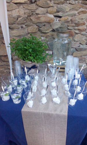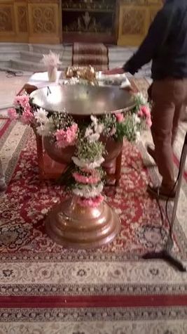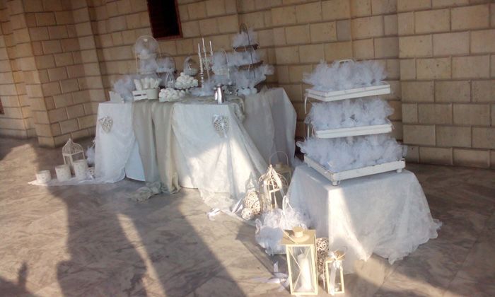- Στολισμό του τραπεζιού με τις μπομπονιέρες (γυάλα με μπεζέδες, σύνθεση με λουλούδια, γυάλες με κεριά, διπλά τραπεζομάντιλα)